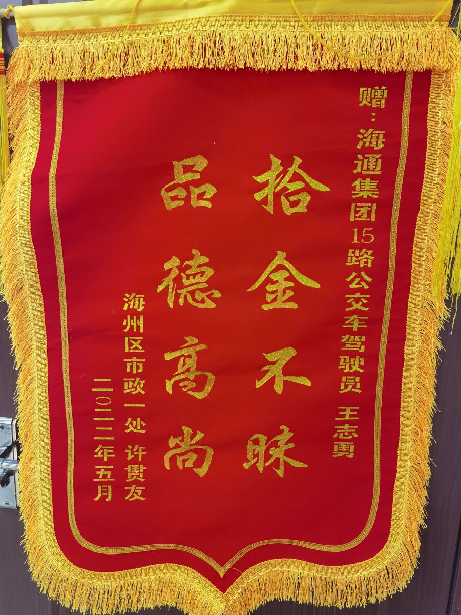 晚班收班后的王志勇接到了失主許先生的電話,兩人準時來到約定地點,許先生也順利的取回了手機。據許先生講述,當日因上車太著急,起身的時候手機滑落在了站臺上,本以為找回無望,沒想到被公交駕駛員拾獲。感激之情無以言表,次日許先生將一面印有“拾金不昧,品德高尚”的錦旗送至公交集團,以此感謝王志勇的幫助。與此同時,又致電所屬分公司對王志勇師傅的行為表示高度的贊揚,表揚王志勇是弘揚社會主義新風,傳播社會正能量的優秀公交司機。
