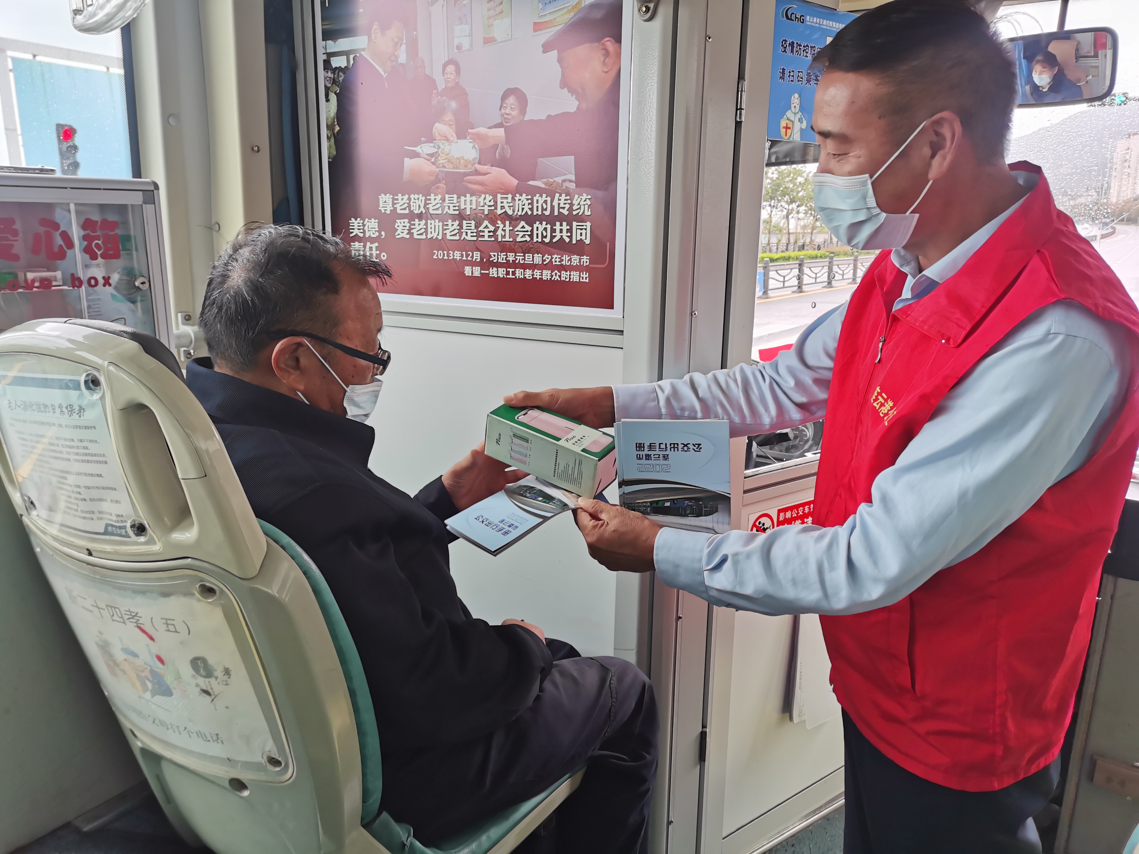 當天志愿者們分組跟車,走進車廂進行疏導服務,并送上小禮物為老年乘客送上節日的祝福。在車廂內,志愿者們講解了老年乘客乘坐公交車的注意事項;提醒乘客應正確佩戴口罩乘車;號召和宣傳青年乘客主動為老人讓座等。當遇到行動不便、手提重物的老人,志愿者們紛紛主動上前服務,“大媽,您別著急,我扶您上車”“大爺,您別動,行李我幫您拿”“爺爺,您先別動,等車停穩了,您再起身...”當遇乘客問詢時,志愿者們總是耐心解答,幫助有需要的乘客上下車。在服務的同時,還聽取了老年乘客對公交的意見和建議。“老吾以及人之老”,看著一張張洋溢著幸福和充滿笑容的臉,志愿者們心里感到陣陣滿足。