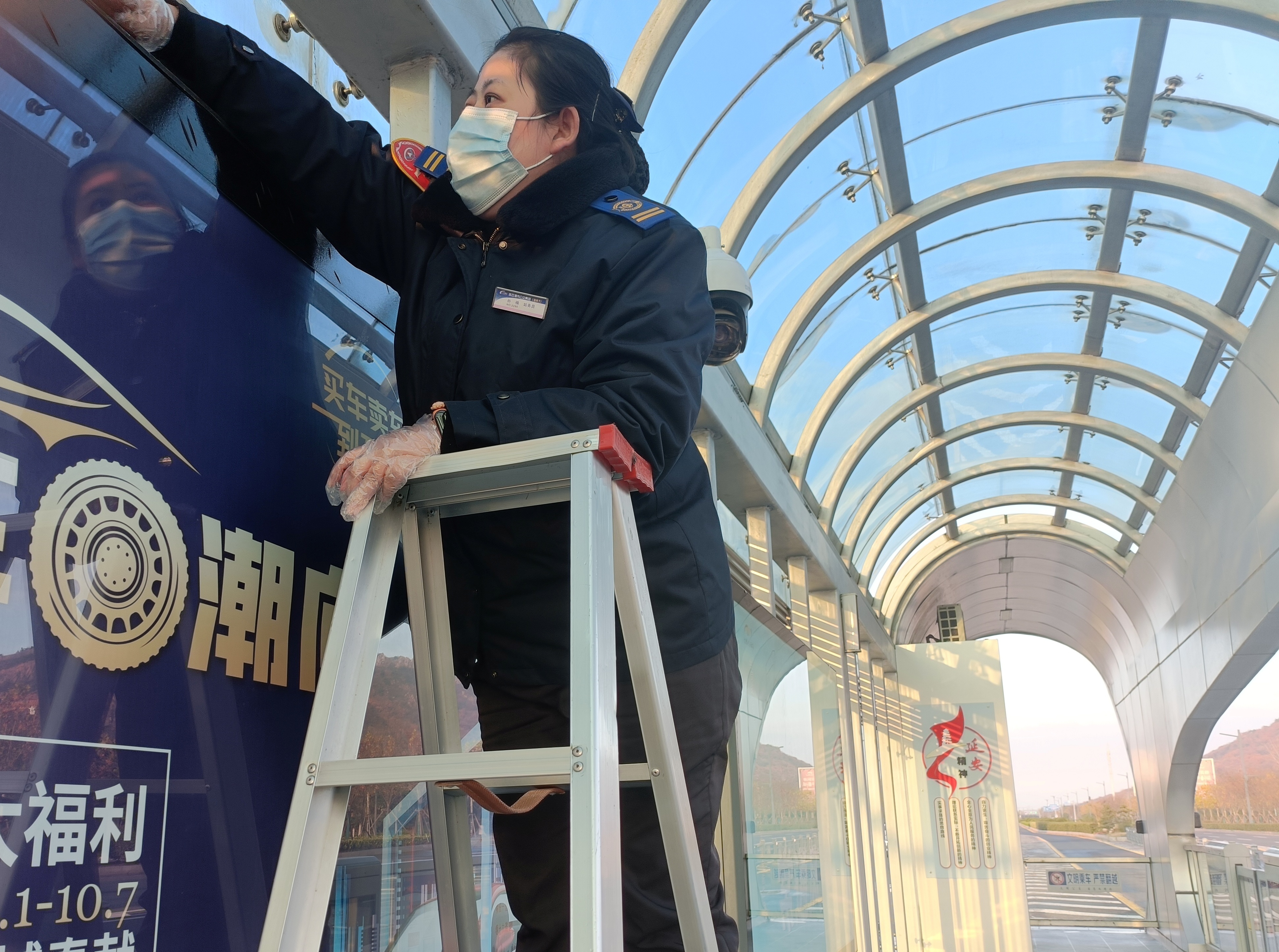 在空蕩安靜的站臺,站務(wù)員忙碌的身影顯得尤為生動而美麗。11月15日以來,因疫情原因BRT全線運營都受到了不同程度的影響,海州區(qū)域內(nèi)公交暫停運營,連云區(qū)乘坐BRT的乘客也變得寥寥無幾,以往忙碌喧鬧的站臺此時卻空空蕩蕩。為了保證站臺防疫工作安全到位,同時也為了隨時給乘客做好解釋工作,BRT的站務(wù)員們依然早出晚歸,堅守在一線崗位。疫情不僅封住了乘客的腳步,也把很多站臺保潔封在了家中,無法到崗。在這樣的情況下,站務(wù)員們主動承擔(dān)起了“保潔員”的角色。