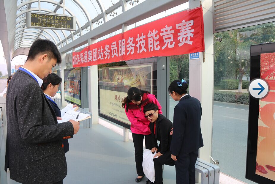 2015年10月29日,在海通集團和海通公交的籌備和組織下,快速公交站務員服務技能競賽活動圓滿結束。本次技能競賽分為理論考試和現場技能考核兩個部分。56名站務員參加初選,經過嚴格選拔, 16名優秀站務員被選拔出來參加決賽,決賽在郁海廣場上行站進行,分為禮儀服務、售票操作、應急處理、安全檢查等環節評比,并對站務員進行綜合打分。