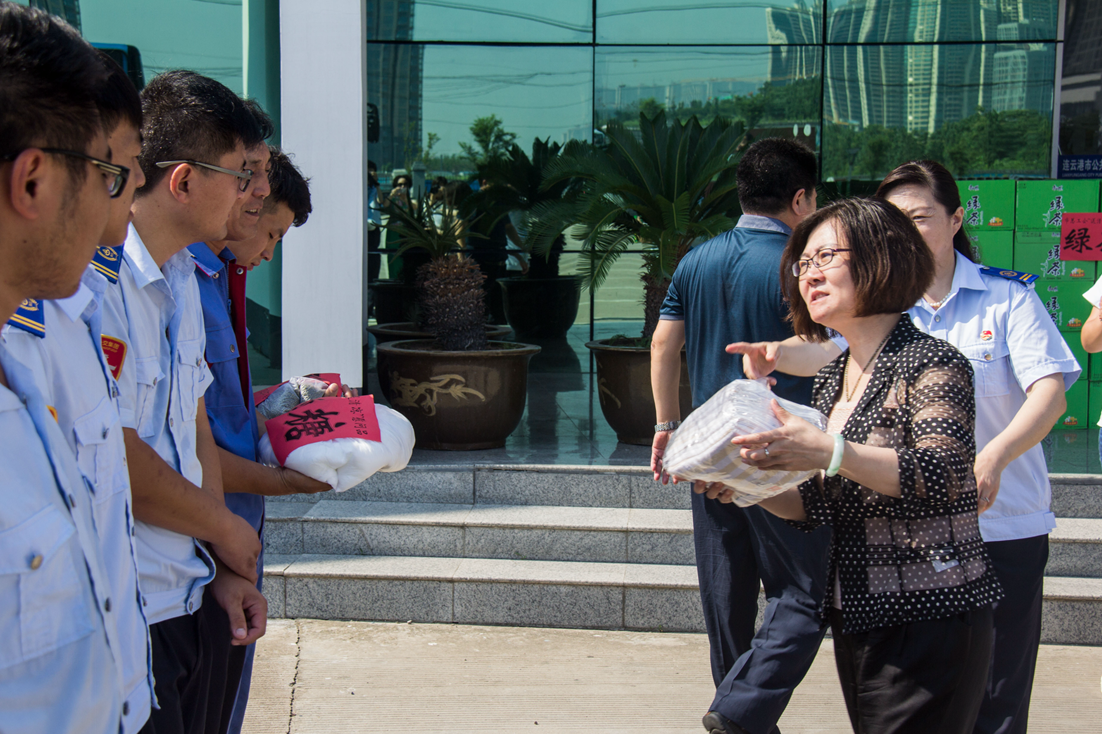 進入“三伏天”,我市迎來高溫天氣,室外高溫高達36攝氏度。公交1600余名職工戰高溫、斗酷暑,奮戰運營第一線,方便廣大乘客出行。秦云一行為職工送來飲料、綠豆、白糖、毛巾、香皂、花露水等防暑降溫物品,感謝公交職工在高溫酷暑條件下為廣大市民出行所作出的突出貢獻,并詳細詢問了他們在高溫期間的工作和生活,反復囑托他們一定要注意身體健康,牢記安全生產。