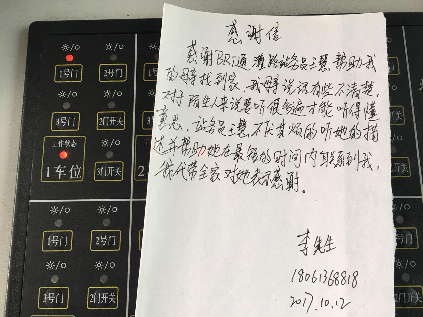 2017年10月11日的晚上,從B12車上下來一位神色慌張,說話不清楚的老人,在我慢慢的詢問下得知老人是迷路了。“老人家,您不要慌,有沒有家里人的電話號碼?我讓您的家里人來站臺接您”。在等家人來接老人期間,我不斷地安撫著他的情緒。不一會,他的兒子過來接她,老人在跟隨他兒子離開的時候,一直不停的對我說著說謝謝。第二天,老人的兒子專程送來了一封感謝信,當看到沉甸甸的信件時,我的心里暖暖的。