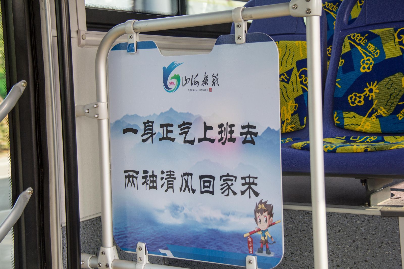 公交集團在市紀委、市交通控股集團的大力支持和指導下,立足行業特點,在做好前期調研的基礎上,以“山海廉韻.與廉同行”文化為主題,選擇15路、19路上2臺公交新能源車輛為載體,將我市乃至我省的廉政文化融入、滲透到其中,打造出“山海廉韻.廉政文化”示范車。