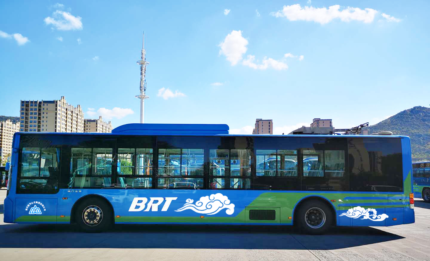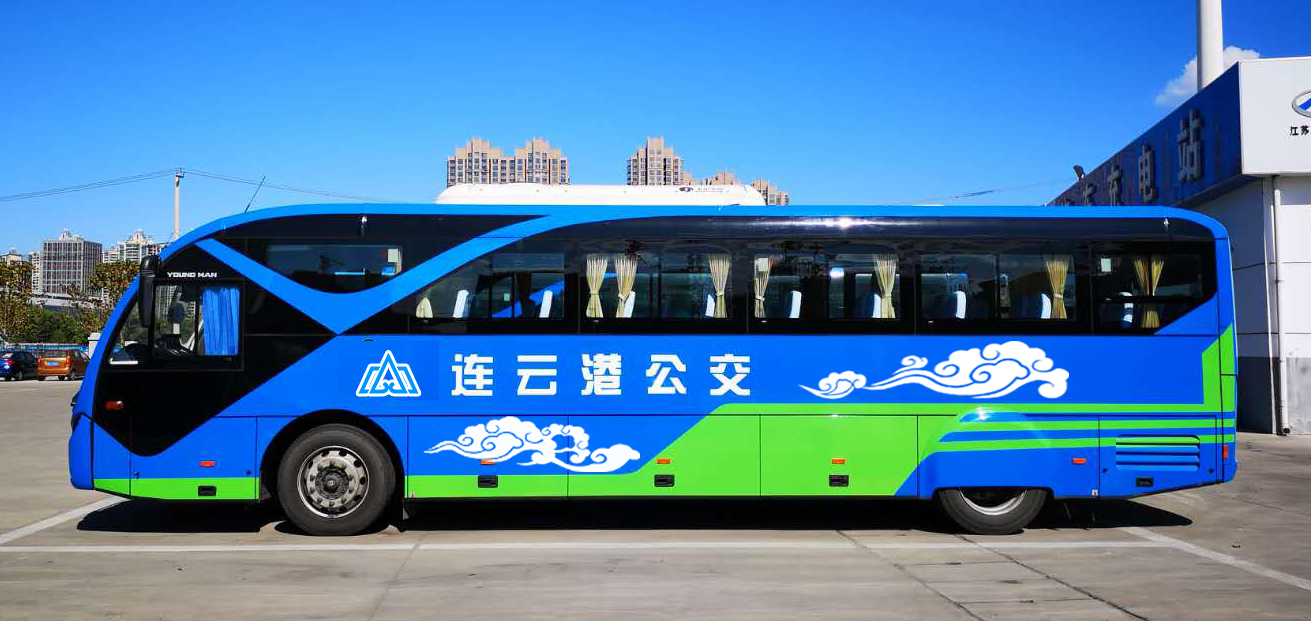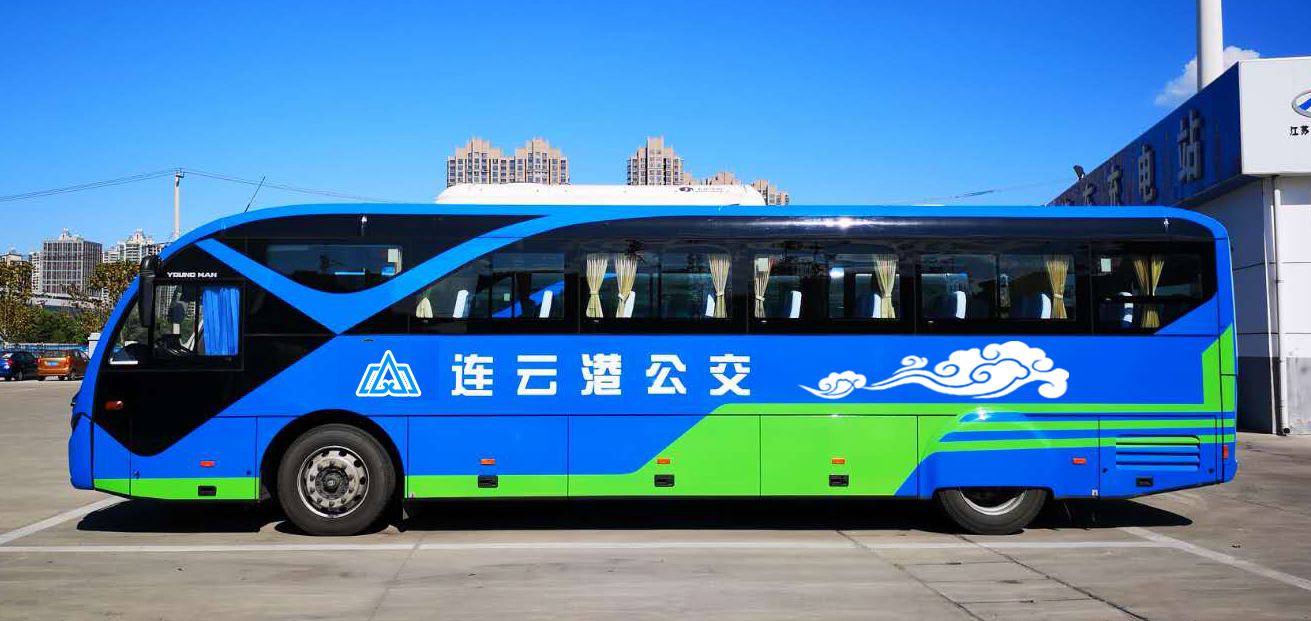 連云港公交車身整體為藍色,代表著大海和廣闊的天空,綠色造型代表海鷗,翱翔在藍天和大海之上;綠色凸顯清新和盎然生機,也表達了綠色公交的發展理念。祥云是中國傳統的吉祥圖案。碧海藍天、海鷗祥云相得益彰,勾勒出一幅“海鷗飛處祥云追”的祥和畫卷。也體現出現代公共交通服務民生的和諧美好。
