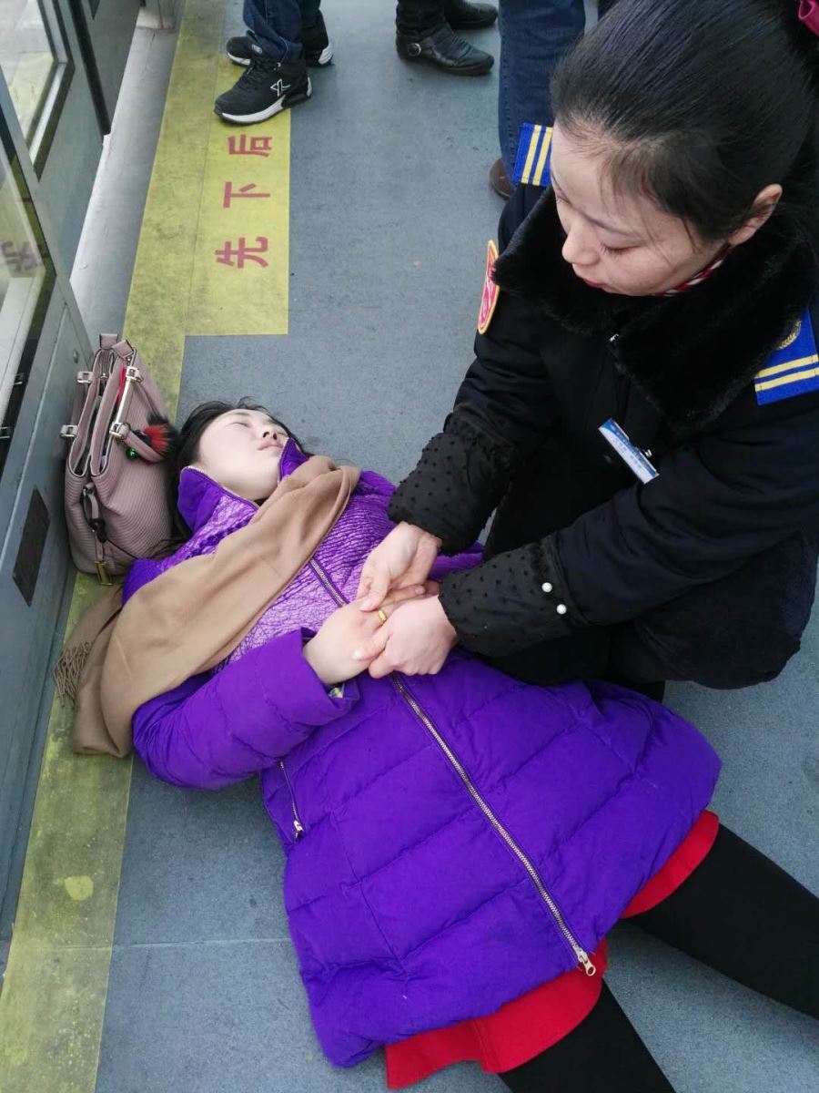 2018年1月26日下午16:15分,購物中心站內發生了驚心動魄的一幕:一名中年女子在站臺內等車時,突然暈倒失去意識,頭撞在BRT安全門的擋板上,牙齒咬得咯咯作響疑似癲癇發作,當班的站務員朱海瑞、楊廷鳳發現后跑上前去,只見倒地女子雙眼發直,嘴唇發紫,面部肌肉抽搐,口鼻中有分泌物流出,上下牙床緊緊咬住。朱海瑞來不及考慮立即將口袋中的員工卡塞入其口中,防止她咬傷舌頭,一邊用手用力搓乘客的手,同時楊廷鳳立即掏出手機報120,并有序指引乘客上下車,維護好站臺秩序。隨后趕來的急救車對女子進行了初步診斷,確定為癲癇,在朱海瑞和醫生的幫助下,患病乘客已漸漸恢復正常,原來這位乘客由于家里有急事,忘記吃藥。朱海瑞立即端來熱水方便乘客服用隨身攜帶的藥物并不時安慰她,經過120醫生再次診斷身體無礙后,這名女士才踏上回家的路。