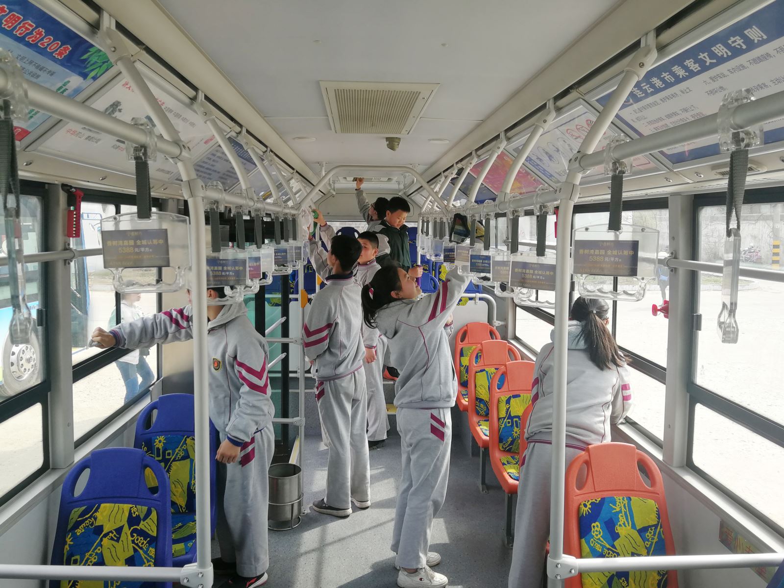 活動中,孩子們在老師的帶領下,在華威公交場站對公交車輛進行了衛生清潔。大家兩人一組、五人一群,手拿毛巾對車廂內的座椅、扶手等處進行了認真擦拭,忙的是不亦樂乎,但臉上的笑容卻十分燦爛。清潔結束后,公交集團公交事業一部分公司經理為孩子們講解了公交車廂內安全設施的使用方法,講解過程中還與孩子們進行熱烈的互動,告知孩子們要多學習公共安全知識,如遇突發危險時,在有能力保護自己的同時也要去幫助身邊更多需要幫助的人。最后,孩子們來到了公交智能調度中心,觀摩現代公交運營的智能化監管系統,同時由工作人員向孩子講解了公交駕駛員在工作中不怕苦、不怕累,持之以恒為民服務、無私奉獻的“雷鋒精神”。