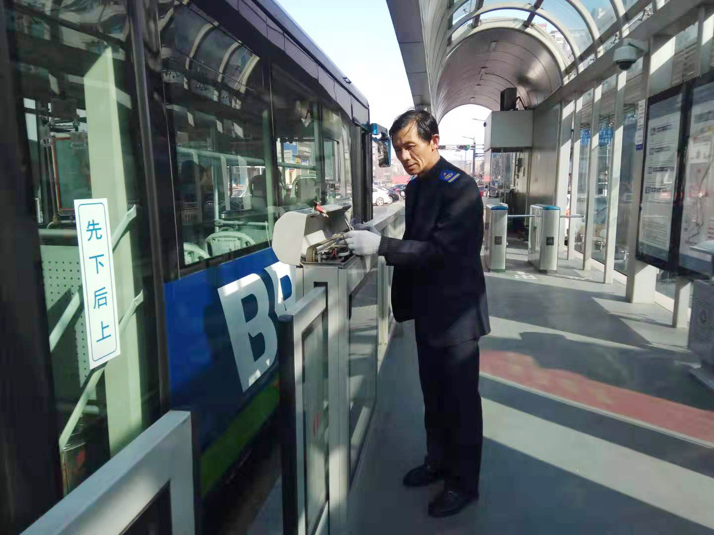六年多前BRT建成開通時,尹德軍師傅和大家一樣,對BRT站臺的一切都是從零開始,但是現在,尹師傅卻是整個公司里最熟悉BRT站臺設備的人,也是站務員最熟悉的親人。站臺安全門打不開,站務員打電話找尹師傅;設備間排風扇不工作了,站務員找尹師傅;售票房的燈不亮、桌子、椅子壞了,站務員都找尹師傅。站務員的工作時間是早上五點半到晚上九點,站務員們有早、晚班的區別,可是站臺維修員尹德軍師傅是沒有上下午班之分的,不管站務員是早上五點多打電話找他,還是晚上八九點時找他,接到電話的尹師傅總是第一時間內趕到站臺,幫助站務員解決難題。在BRT成立的七年的時間里,尹德軍師傅他自己也不知道有多少個清晨在睡夢中被電話鈴聲叫醒、多少個晚上在一家團聚吃晚餐的時候放下碗筷,趕去站臺搶修設備。