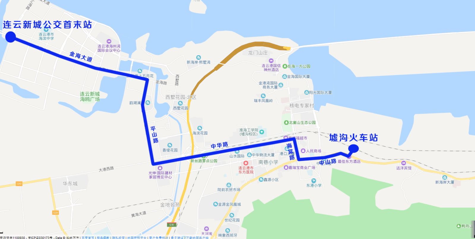1、線路走向:墟溝火車站—中山中路—海棠中路—中華西路—平山北路—金海大道—連云新城首末站