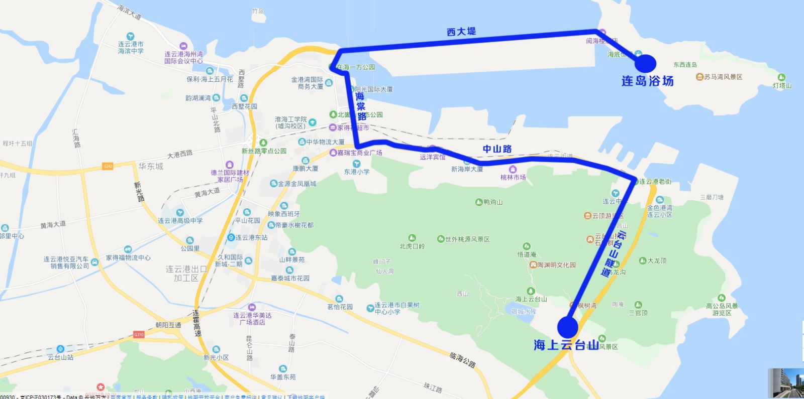 2、途經站點:海上云臺山、連云古鎮、新海岸大廈、墟溝火車站、陽光國際、在海一方公園、金海國際、連島浴場